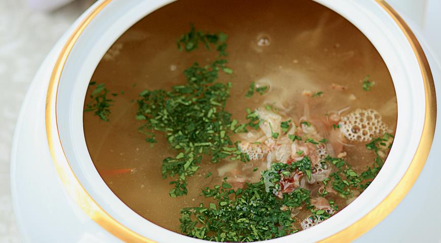 Готовый бульон процедите в чистую кастрюлю и доведите до кипения. Добавьте лук с томатной пастой и варите 10 мин. на среднем огне. Затем добавьте огурцы вместе с рассолом, мясные продукты, маслины и каперсы. Доведите до кипения и варите на медленном огне 10 мин. Снимите с огня, посолите и поперчите, оставьте под крышкой на 15 мин.